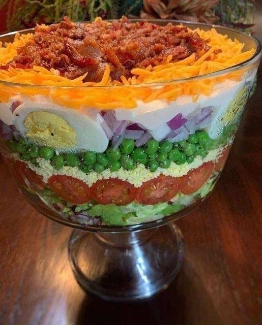 Place the chopped lettuce in a large flat bowl, layer with onion, peas, shredded cheese, cauliflower, and bacon on top.